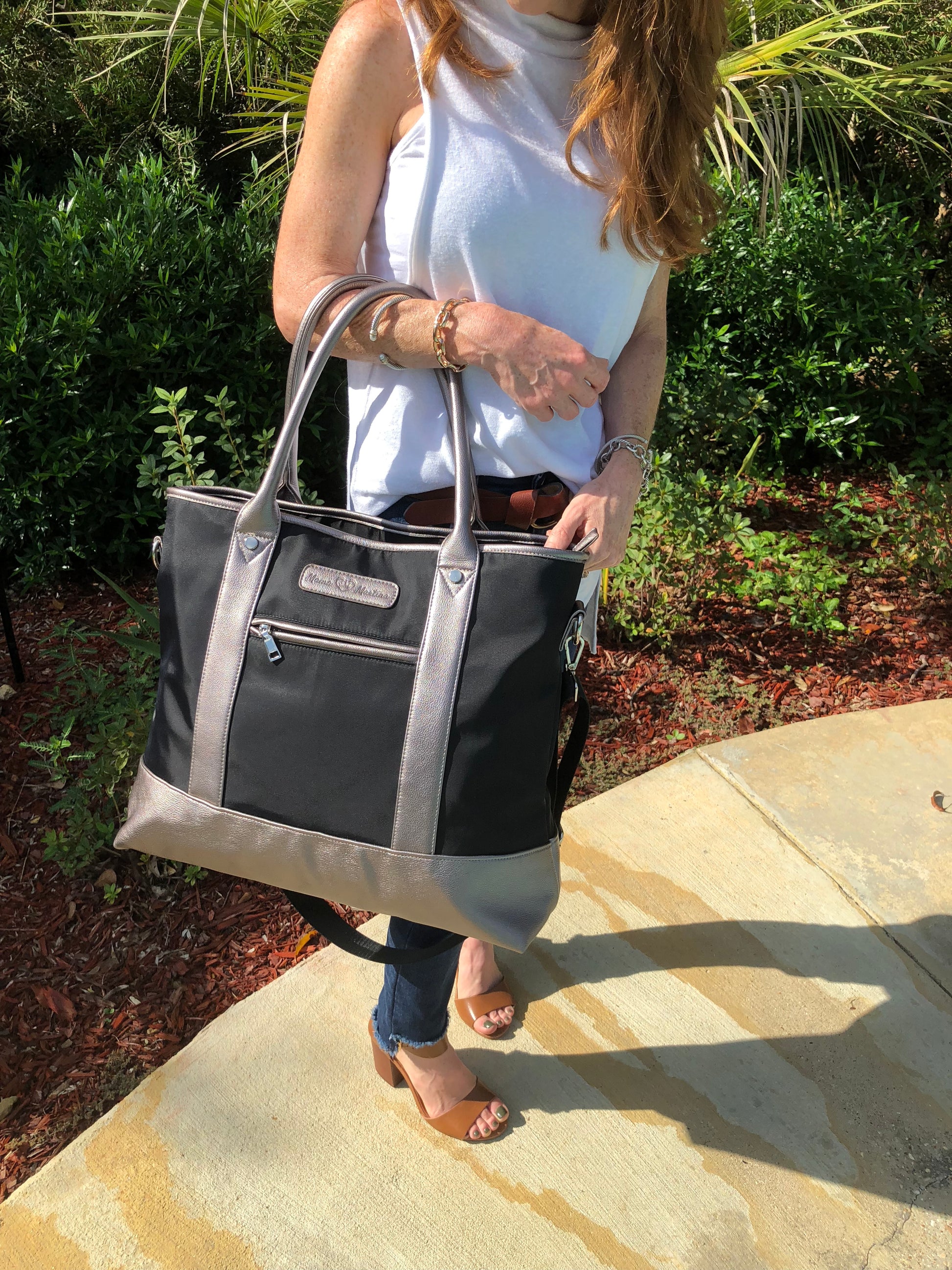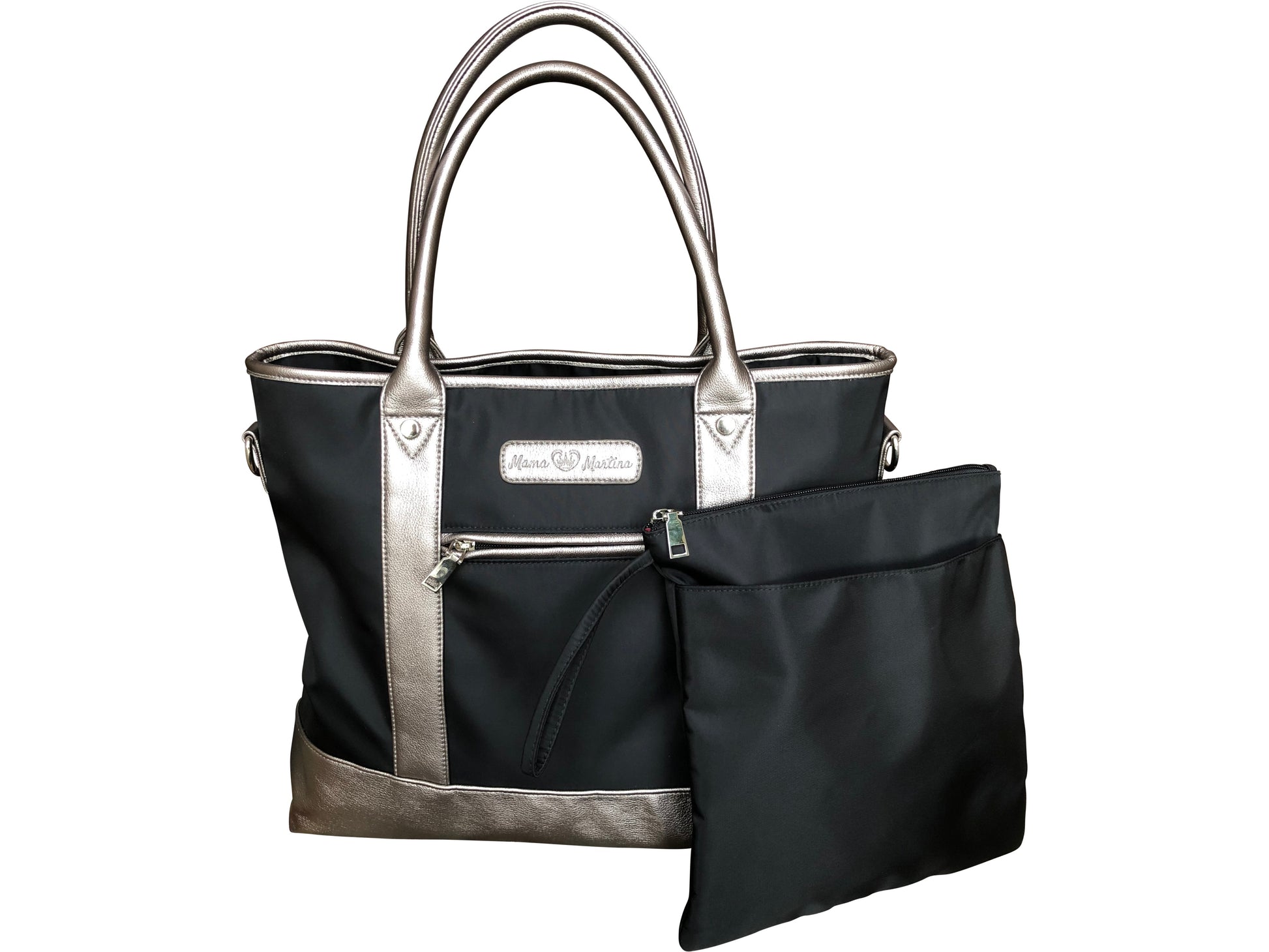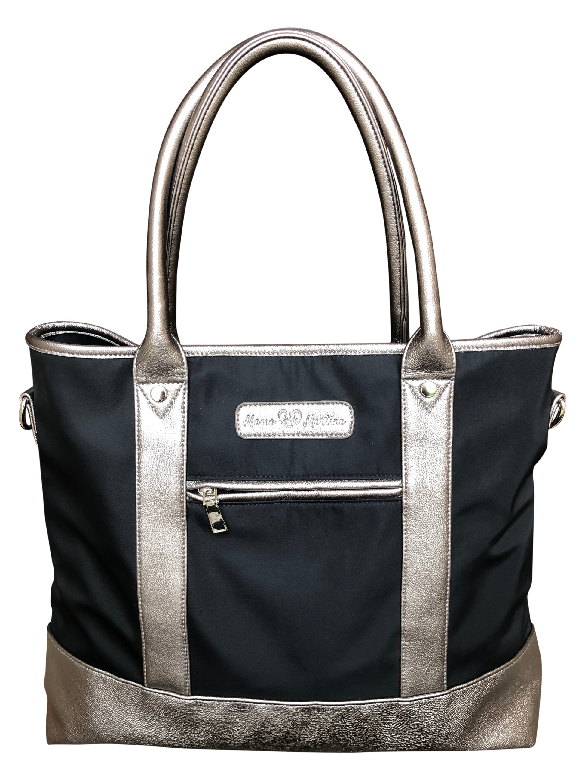 This is a practical and trendy oversized mama bag that will help you stay organized. Can we mention it's also very lightweight? We picked materials that are user-friendly and durable. The handles are longer than what you'd normally see in other bags. The tote-style bag is easy to carry around, zipped or unzipped. The padded handles stay put on your shoulder, which is why this bag is so comfortable to use even with a "heavy load". Black with silver trim and hardware.